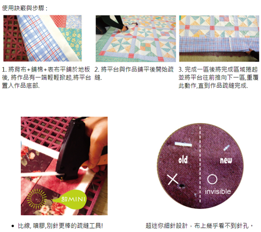 穩穩固定表布、鋪棉與背布,不移動,不論手縫或機縫壓線都可完美完成