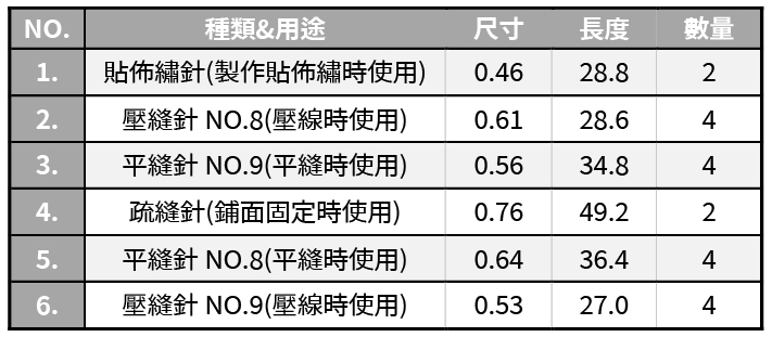 壓線針,貼佈針,疏縫針,各盡其職,細細的針頭,讓你的作品看起來更精緻,
