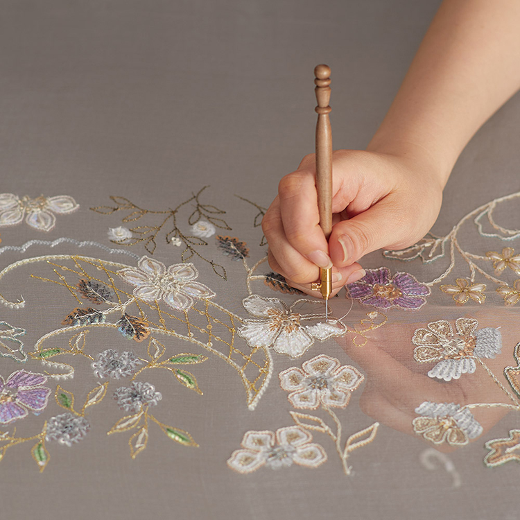 法國傳統刺繡的技法,是高級訂製服刺繡的一種技法。前端使用鉤子狀的鉤針,在裡布那側一個個地刺繡固定珠珠及亮片。
