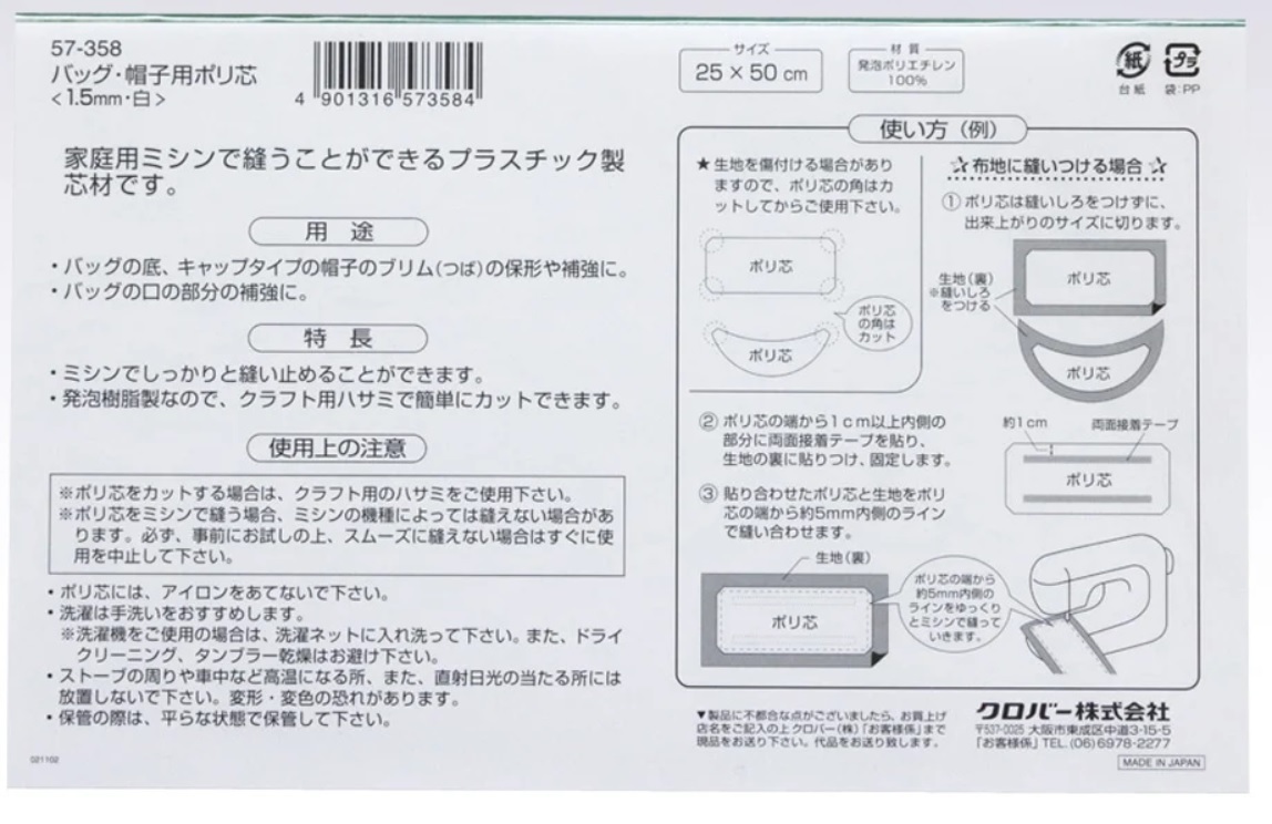 〈Clover可樂牌〉帽簷.包包.袋子用 定型板 棉襯 白色 57-358 57358