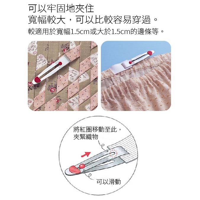 適用於大於1.5公分編織j物 ;也可以穿鬆緊帶。