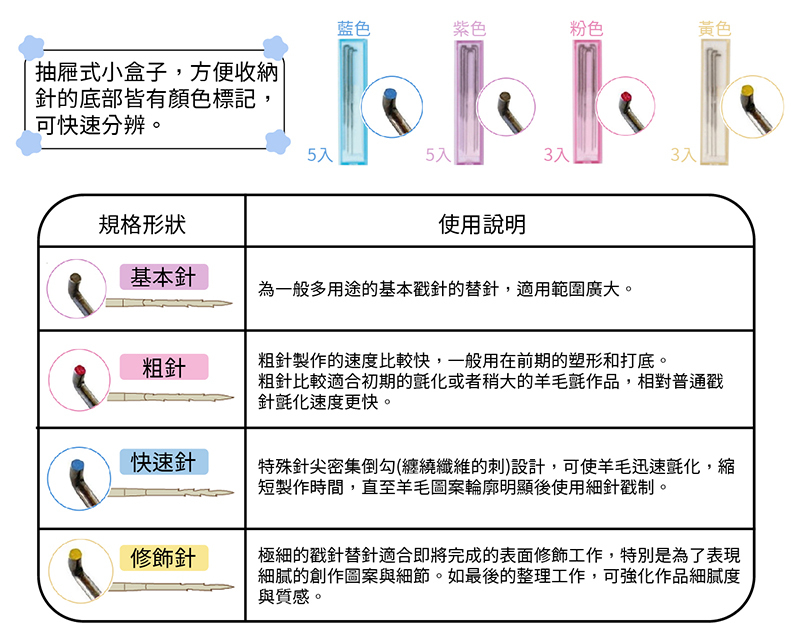 特殊針尖密集倒勾(纏繞纖維的刺)設計,可使羊毛迅速氈化,縮短製作時間,直至羊毛圖案輪廓明顯後使用細針戳制。