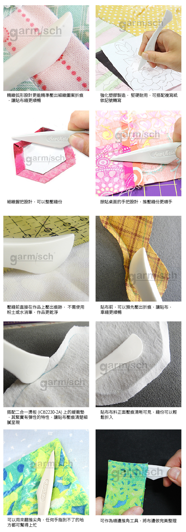 方便縫份倒向固定使用在完成鋪棉後可用來壓出壓線記號,不需粉土或水消筆