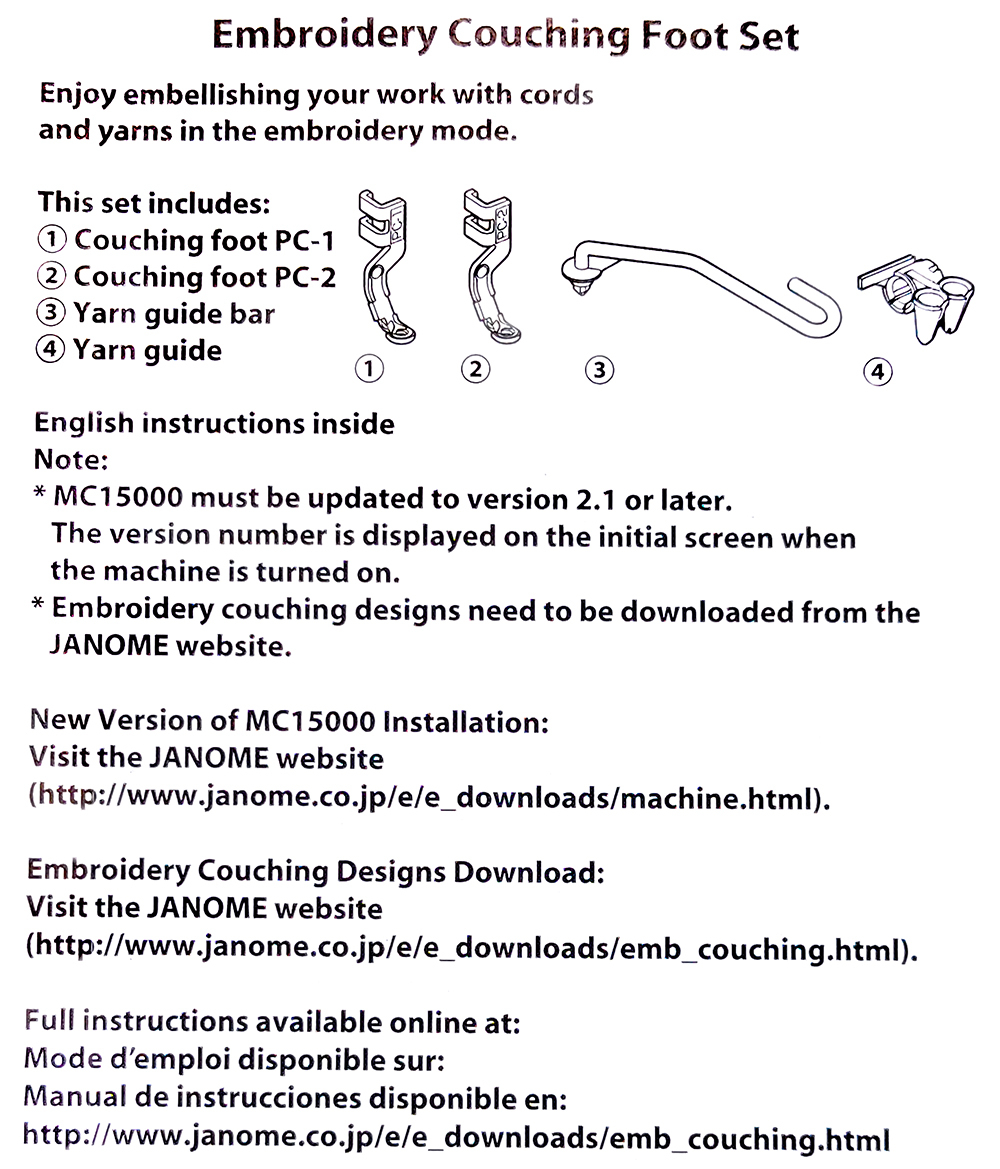 繡花套件帶有兩個用於不同羊毛粗細的壓腳,以及一根導桿,該導桿連接到機器頂部的附加軸孔上。