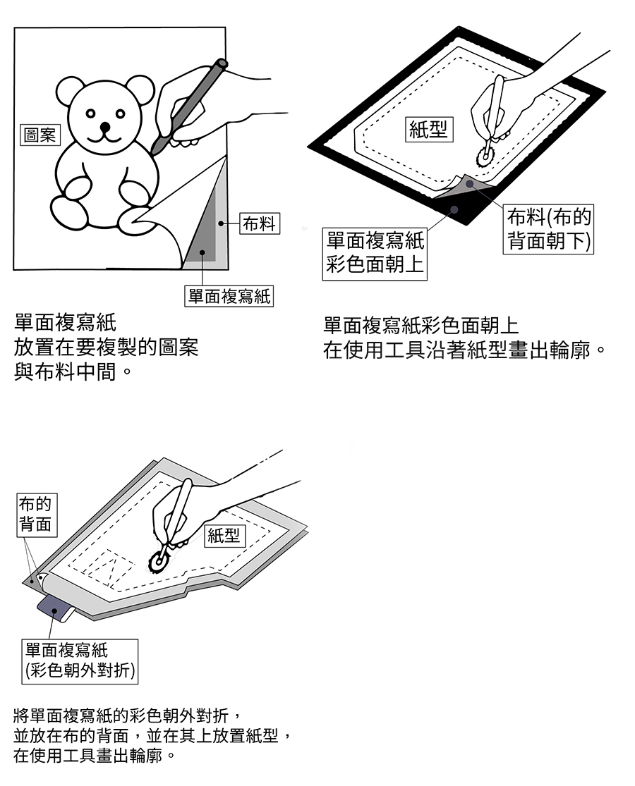 再放置複寫紙,複寫紙有顏料的一面一定要對著布料,