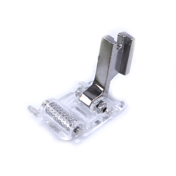 對滾輪壓腳設計能控制更佳, 在人工皮革上縫合時的減少的摩擦, 可適用彈性布料、乙烯基天鵝絨。