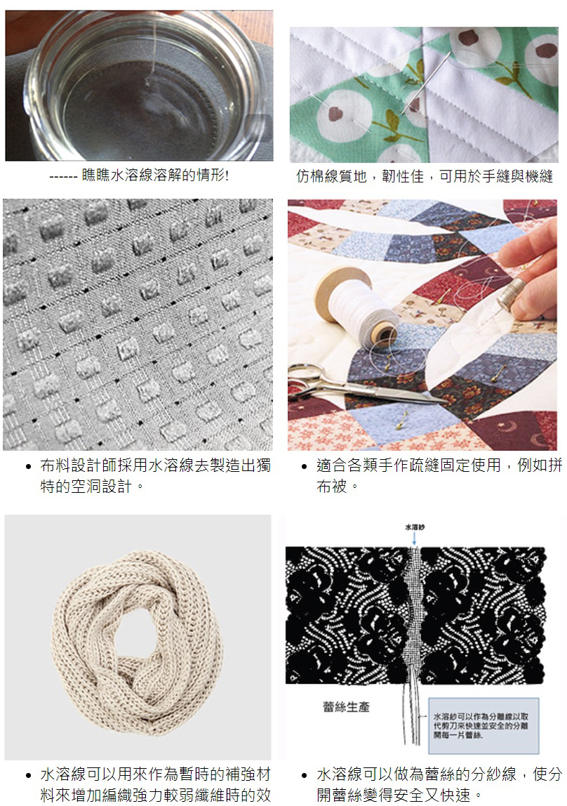 特別是拼布被上的使用,疏縫線在下水洗滌時即可完全溶解不見,不需另外拆線