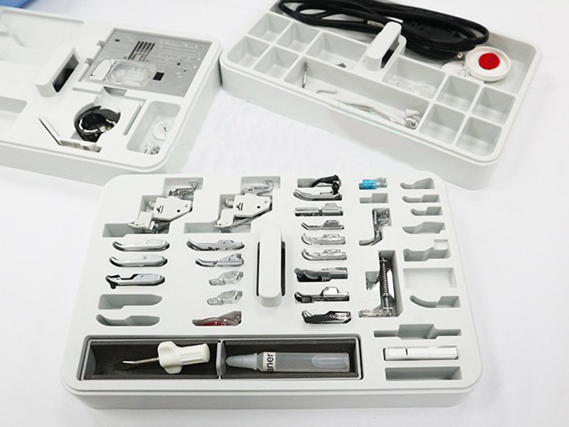 每款壓腳以及配件都有相對應的收納格方便我們拿取。